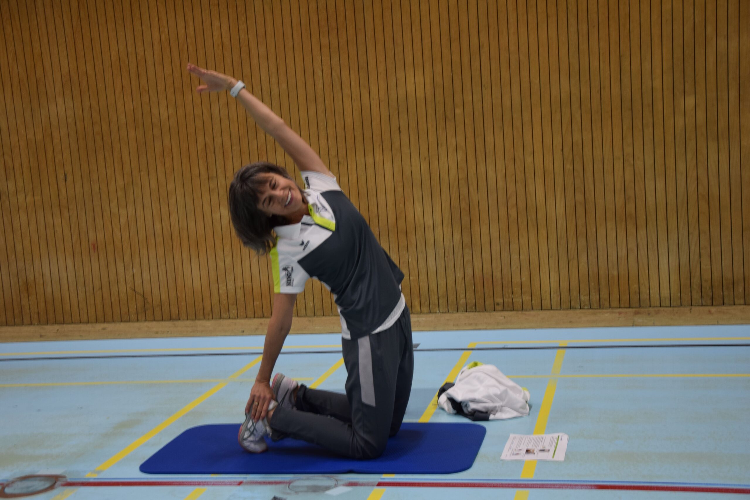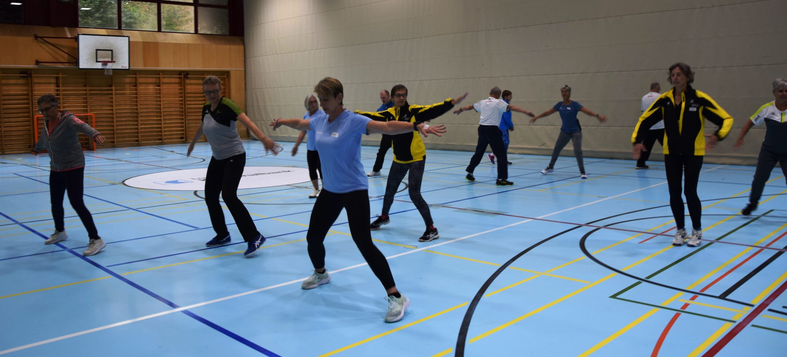 „Mehr Beweglichkeit durch Dehnen/Teil 2“ mit Barbara Bolzern (Kriens). Faszien können verkleben und Schmerzen auslösen sowie steif und unbeweglich machen. Durch regelmässiges Üben in jedem Alter kann dies verbessert werden. Barbara zeigt Dehnungsübungen von Kopf bis Fuss und betont, dass wir die einzelnen Übungen mindestens 2 Minuten machen müssen – die Faszie brauche Zeit um elastischer zu werden. Erst ab 30 Sekunden passiere überhaupt etwas (gem. Faszienforschung). Es brauche eine gewisse Intensität um die Beweglichkeit wieder zu bekommen. Dankbar sind wir für ihren Tipp, doch im YouTube unter „Liebscher & Bracht – die Schmerzspezialisten“ weitere Übungen zu anzuschauen. Auf alle Fälle sind es Dehnungsübungen, die die Kursteilnehmenden in ihrer Turnprobe anwenden können. Super!