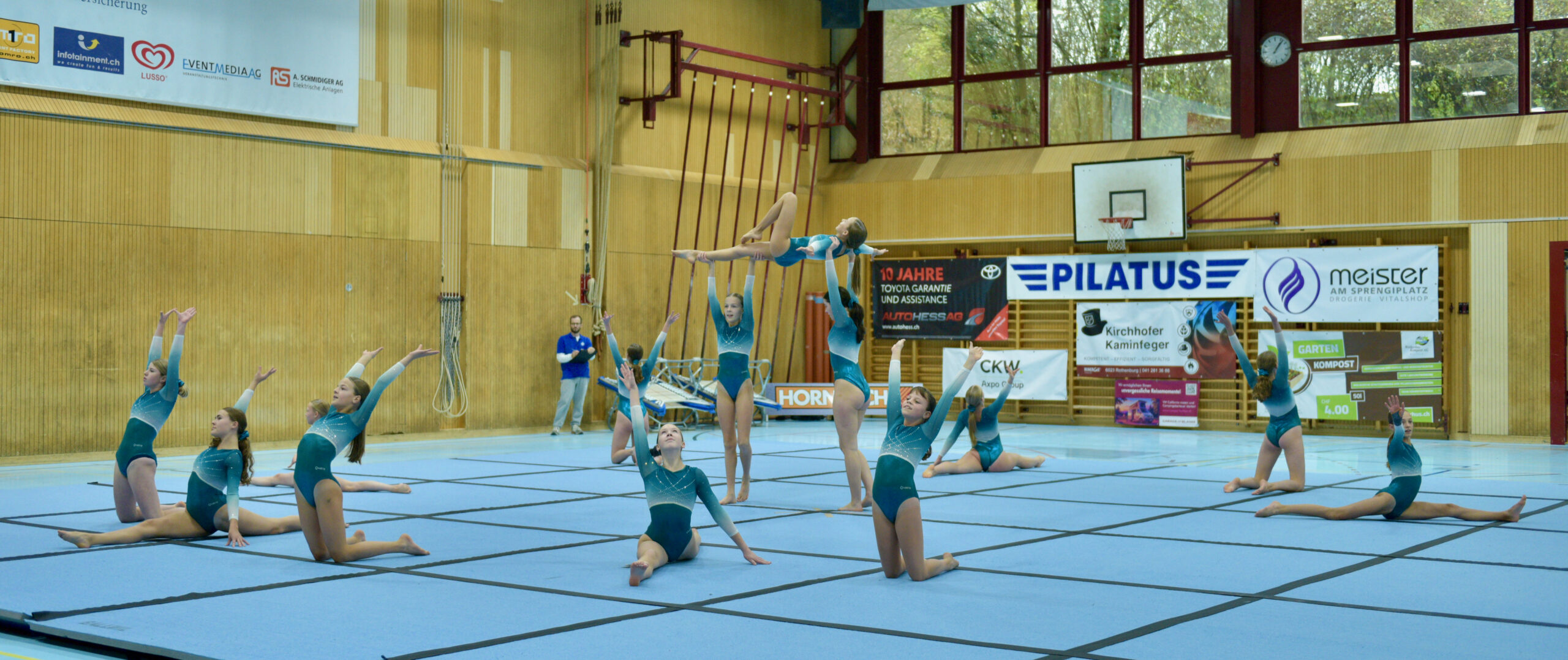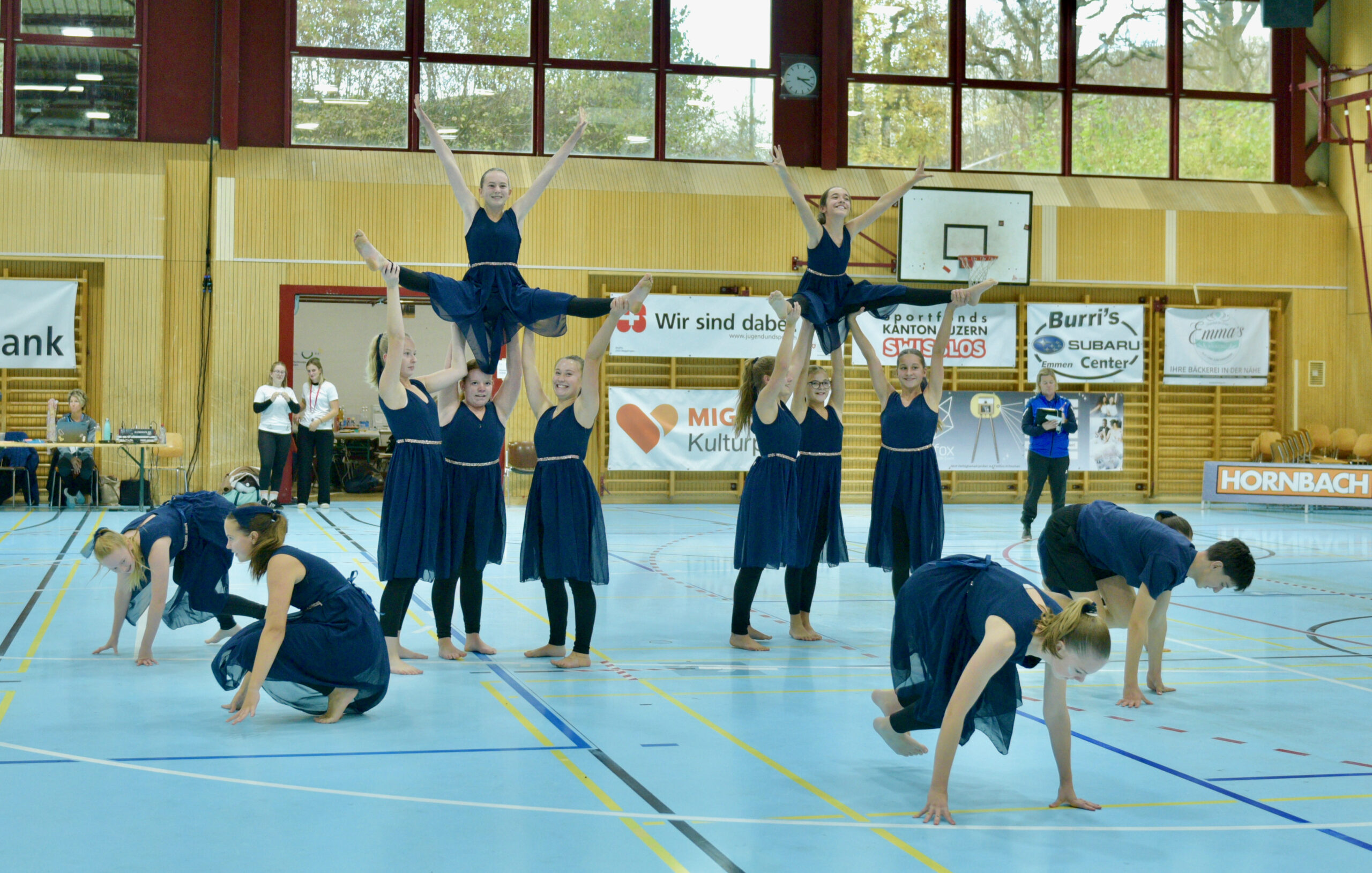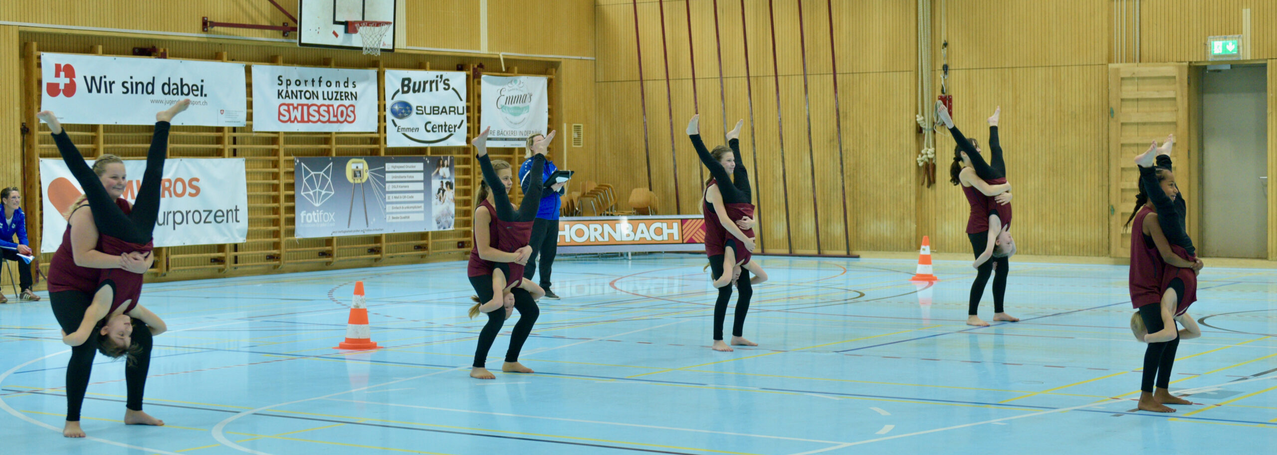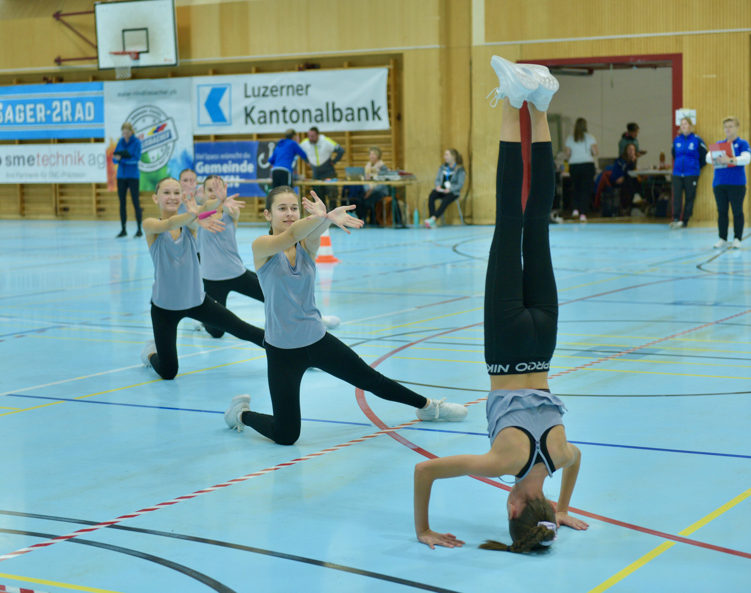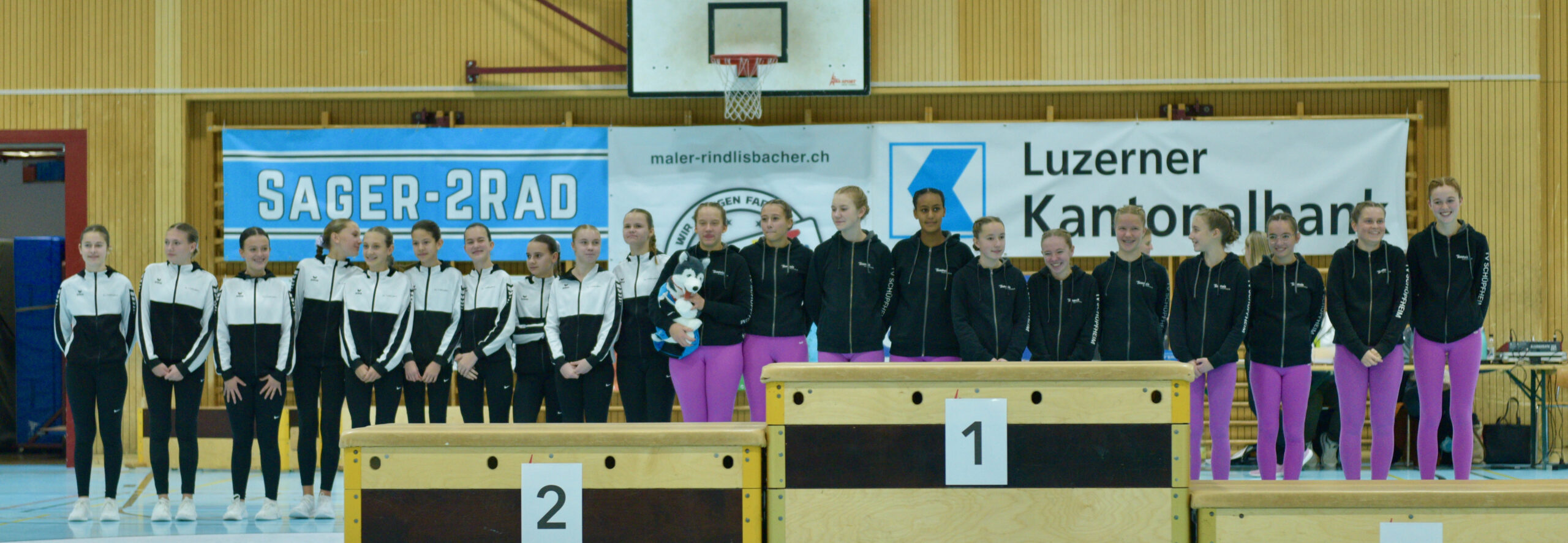 In der Gymnastik starteten die Vereine unterteilt in eine U13 und eine U16 Kategorie. Die Goldmedaille durften sich die 10 Jugendlichen vom TSV Rohrdorf Teensym U16 mit der Note 18.33 um den Hals hängen. Die Silbermedaille konnte sich der ESV Eschenbach in der U16-Kategorie mit der Note 17.78 um den Hals hängen – knapp vor dem STV Ettiswil U16 mit der Note 17.63. Vierter wurde ebenfalls der ESV Eschenbach U13 mit der Note 17.10. Auch die Gastgeber, der TSV Emmenstrand  schickten zwei Gruppen an den Start. Fünfte wurden TSV Emmenstrand U16 und Achte TSV Emmenstrand U13. Engagierte Leiterin des TSV Emmenstrand war Claudia Diltz, OK-Präsidentin vom Gastgeber Emmenstrand.  Sie meisterte ihre Doppelrolle ohne Probleme.