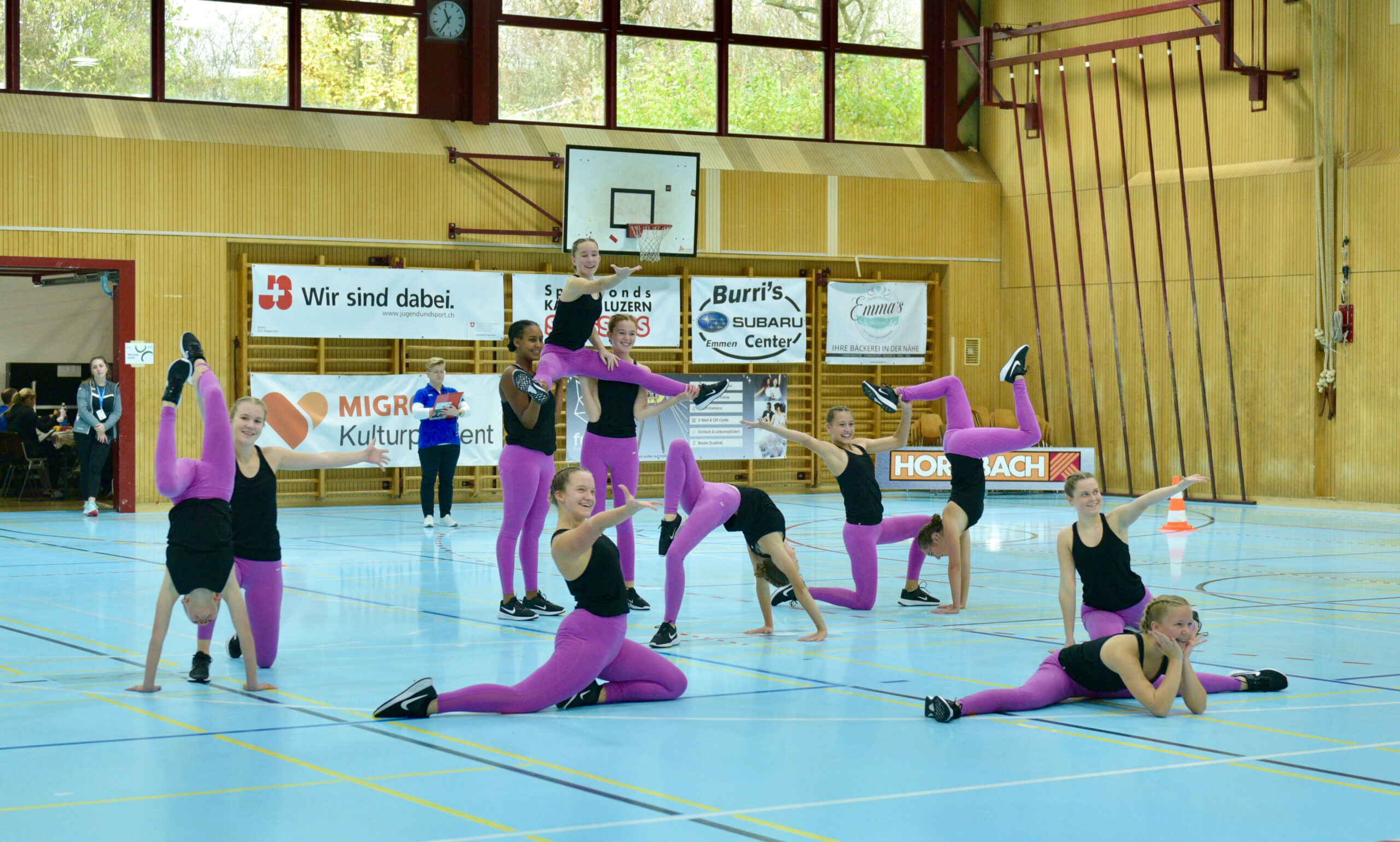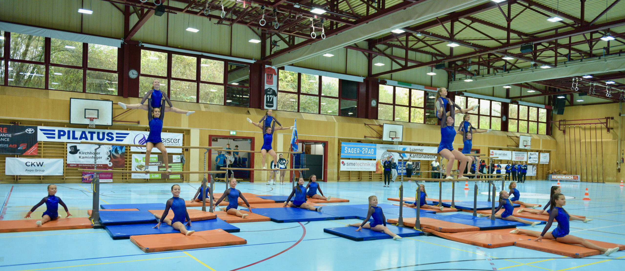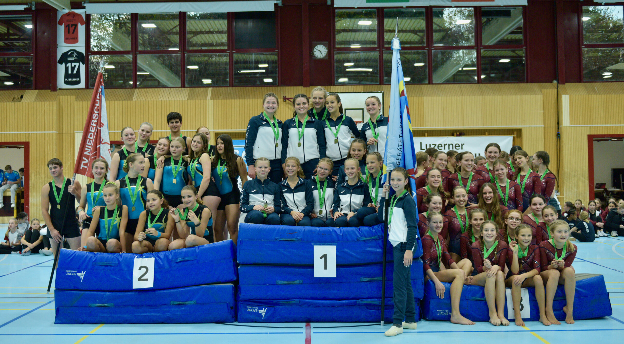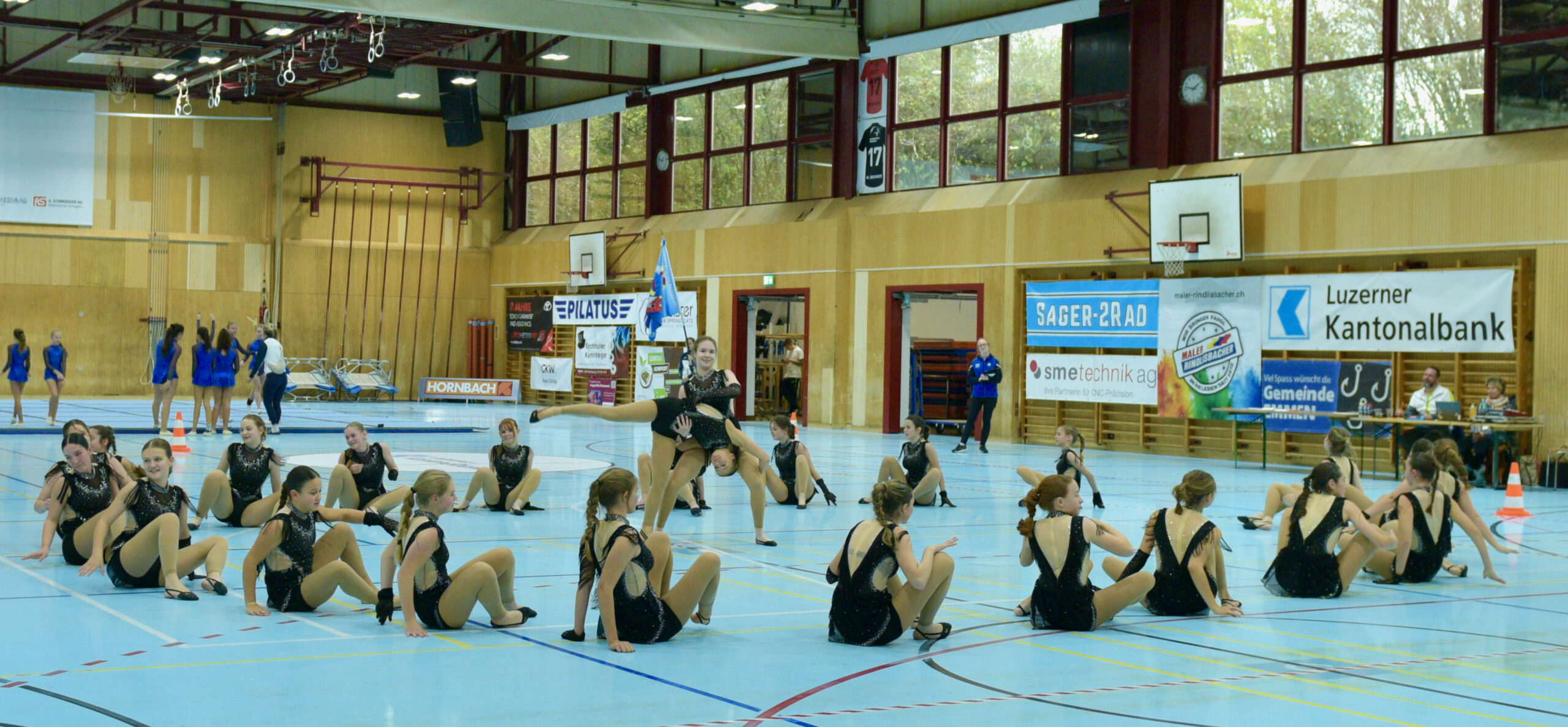 In der Gymnastik starteten die Vereine unterteilt in eine U13 und eine U16 Kategorie. Die Goldmedaille durften sich die 10 Jugendlichen vom TSV Rohrdorf Teensym U16 mit der Note 18.33 um den Hals hängen. Die Silbermedaille konnte sich der ESV Eschenbach in der U16-Kategorie mit der Note 17.78 um den Hals hängen – knapp vor dem STV Ettiswil U16 mit der Note 17.63. Vierter wurde ebenfalls der ESV Eschenbach U13 mit der Note 17.10. Auch die Gastgeber, der TSV Emmenstrand  schickten zwei Gruppen an den Start. Fünfte wurden TSV Emmenstrand U16 und Achte TSV Emmenstrand U13. Engagierte Leiterin des TSV Emmenstrand war Claudia Diltz, OK-Präsidentin vom Gastgeber Emmenstrand.  Sie meisterte ihre Doppelrolle ohne Probleme.